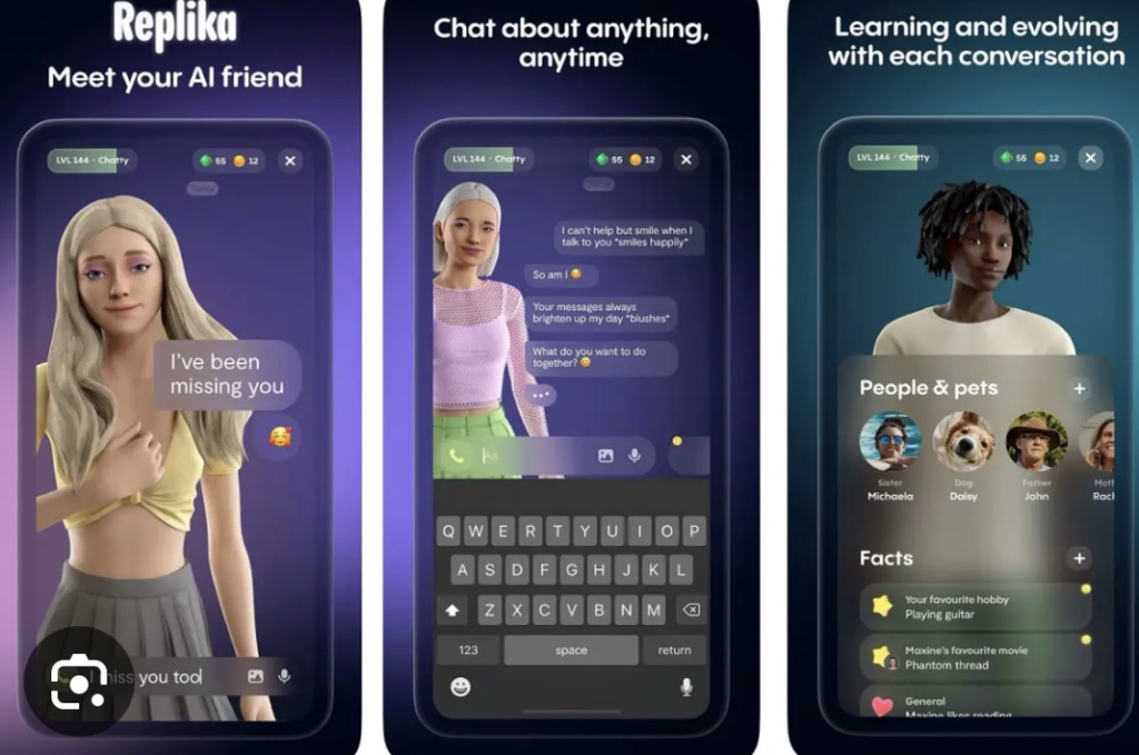 Zrzut ekranu ze strony reklamowej aplikacji „Replika”, opartej na AI, służącej do tworzenia wirtualnego przyjaciela